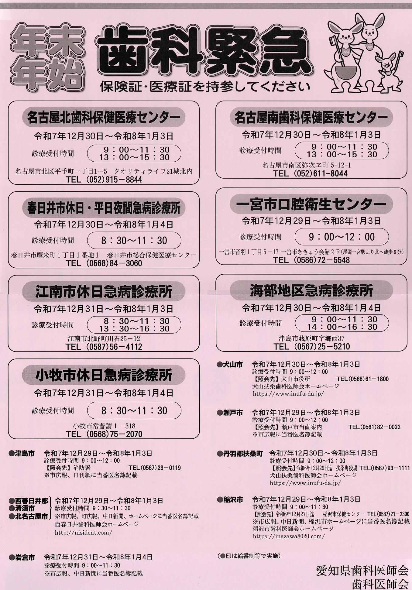 また 医療証をお持ちの方は医療証もお持ちください。休診期間中の歯科緊急対応は休日診療所へ